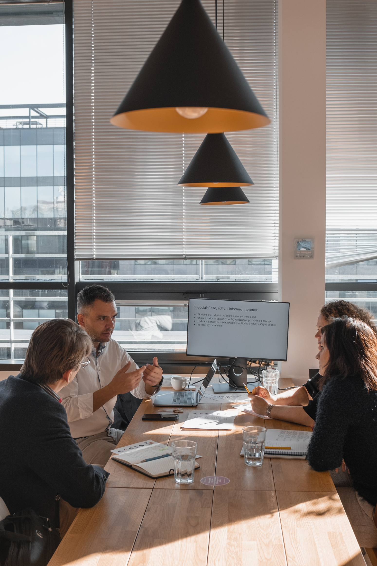 Individuální konzultace – vlevo v bílé košili František Troster, Engineering Director, Avast; vpravo pak náš tým – blíže ke kameře Lucie Brudíková, která se o vaše osobní údaje stará, blíže k oknu Veronika Senciová – ředitelka a zakladatelka O děti postaráno z.s.