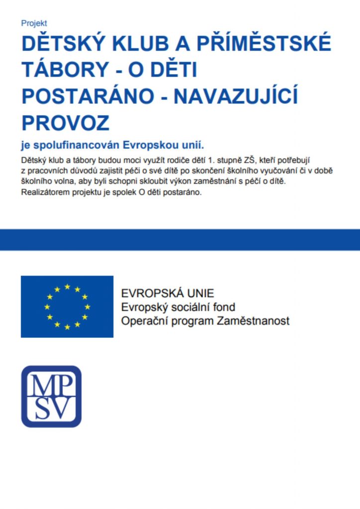 Dětský klub a tábory budou moci využít rodiče dětí 1. stupně ZŠ, kteří potřebují z pracovních důvodů zajistit péči o své dítě po skončení školního vyučování či v době školního volna, aby byli schopni skloubit výkon zaměstnání s péčí o dítě. Realizátorem projektu je spolek O děti postaráno.