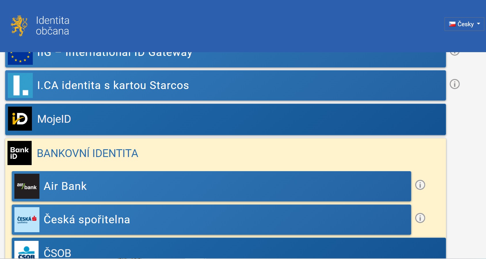 Z dlouhé nabídky vybereme poslední možnost „BANKOVNÍ IDENTITA“ a v rozbalené nabídce vybereme svoji banku. Následně budeme přesměrování na web naší banky, kde potvrdíme, že to jsme skutečně my, kdo se přihlašuje.