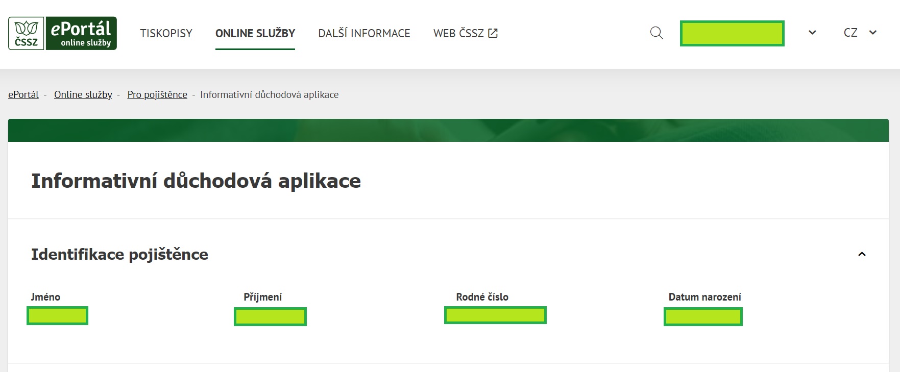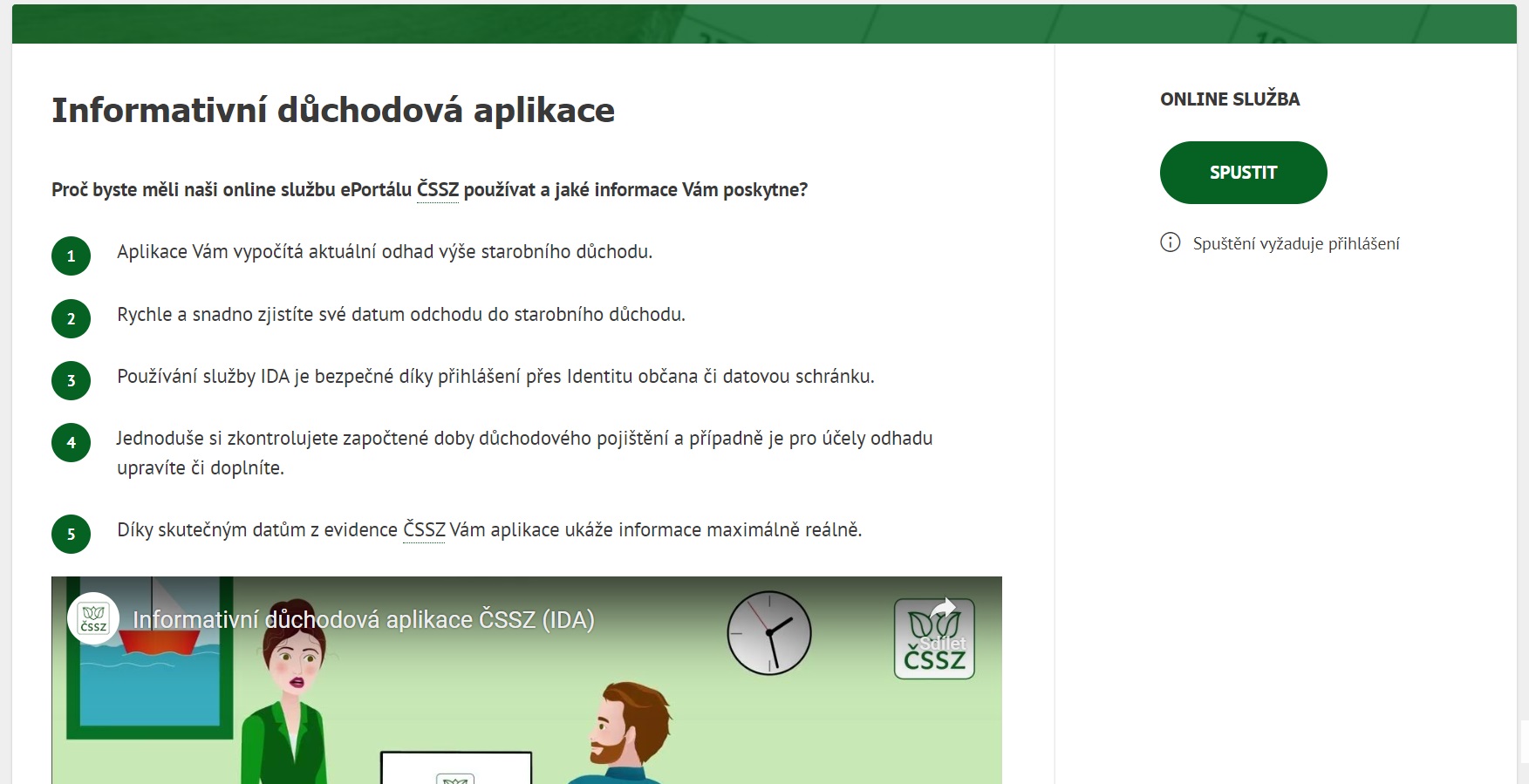Jakmile budete mít bankovní identitu, můžeme se posunout na web Informativní důchodové aplikace a kliknete vpravo nahoře na tlačítko Spustit. Link na aplikaci je: https://eportal.cssz.cz/web/portal/-/sluzby/informativni-duchodova-aplikace