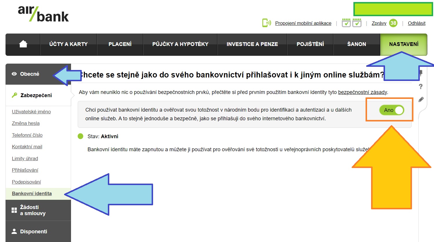 3. v něm „Bankovní identita“ (modrá šipka vlevo dole)