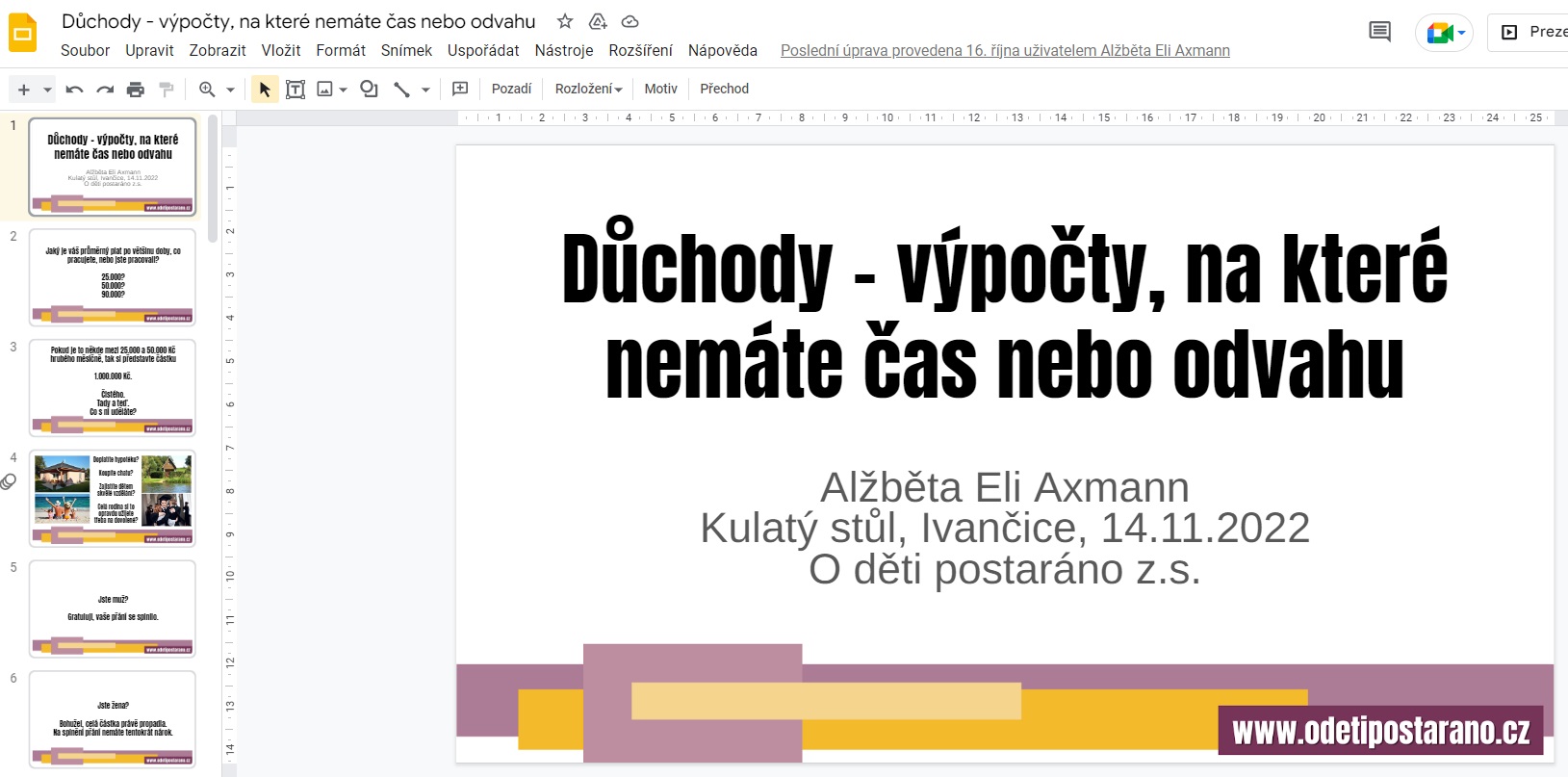 Prezentace se jmenovala DŮCHODY – VÝPOČTY, NA KTERÉ NEMÁTE ČAS NEBO ODVAHU