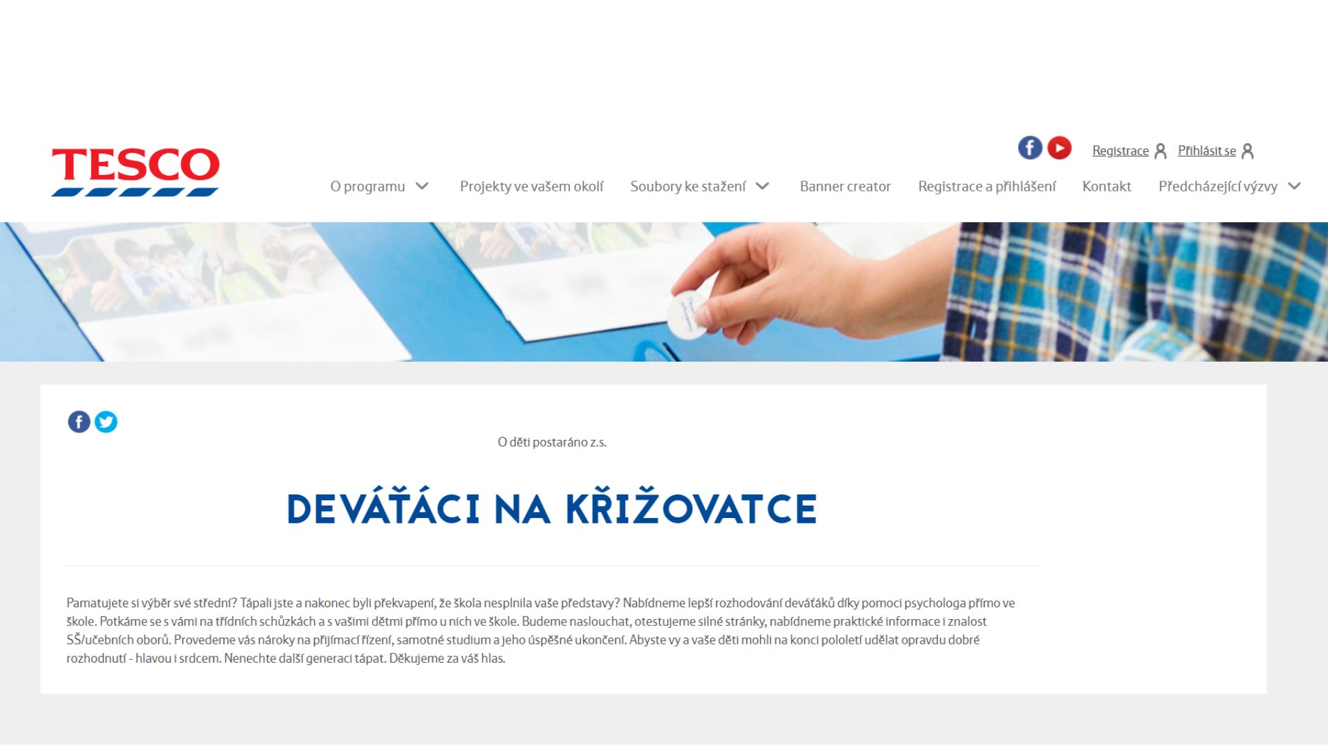 V Tesco po celé ČR probíhá akce „Vy rozhodujete, my pomáháme“. A O děti postaráno z.s. se účastní s prosbou o pomoc s financováním projektu Deváťáci na křižovatce. Kdykoli do 7.8.2022 nás můžete podpořit vhozením žetonu k našemu projektu. I za Váš hlas budeme moc rádi.