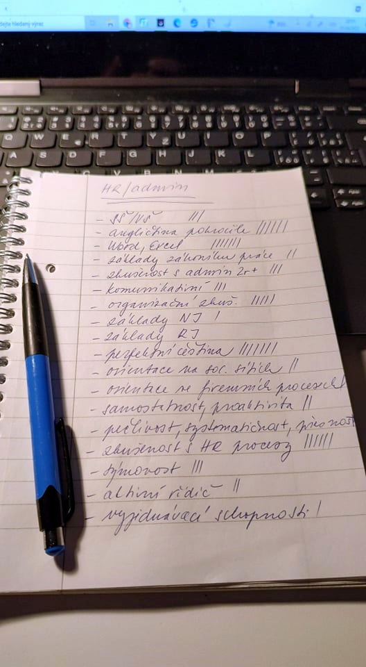 Tohle si rozebereme do detailu v některém z dalších dílů, ale pro začátek jednoduchý tip. Otevřete si třeba jobs nebo práci.cz a najděte si deset inzerátů, které zhruba odpovídají tomu, co byste chtěl/a dělat. Nemusí být aktuální a nemusí být ani všechny ve vaší lokalitě. Důležité je, aby jich opravdu bylo alespoň deset. Pak si vezměte tužku a papír a začněte si vypisovat požadavky. Pokud se některý opakuje, udělejte si k němu čárku, pokud je nový, přidejte ho na seznam. Díky tomu, že vezmete deset, nebo i víc inzerátů, dokážete si udělat opravdu dobrou představu o tom, co je potřeba úplně nezbytně (to jsou ty, co se opakují pořád znovu a u kterých tedy máte nejvíc čárek) a co je fajn mít, ale třeba to nebude pro danou pozici úplně klíčové. Hotový seznam bude vypadat zhruba tak, jako ten na obrázku: