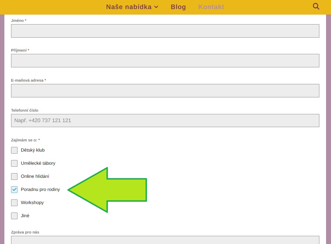 A objednat se do ní můžete jednoduchým vyplněním formuláře na našich stránkách ZDE a zakliknutím možnosti „Poradna pro rodiny“:
