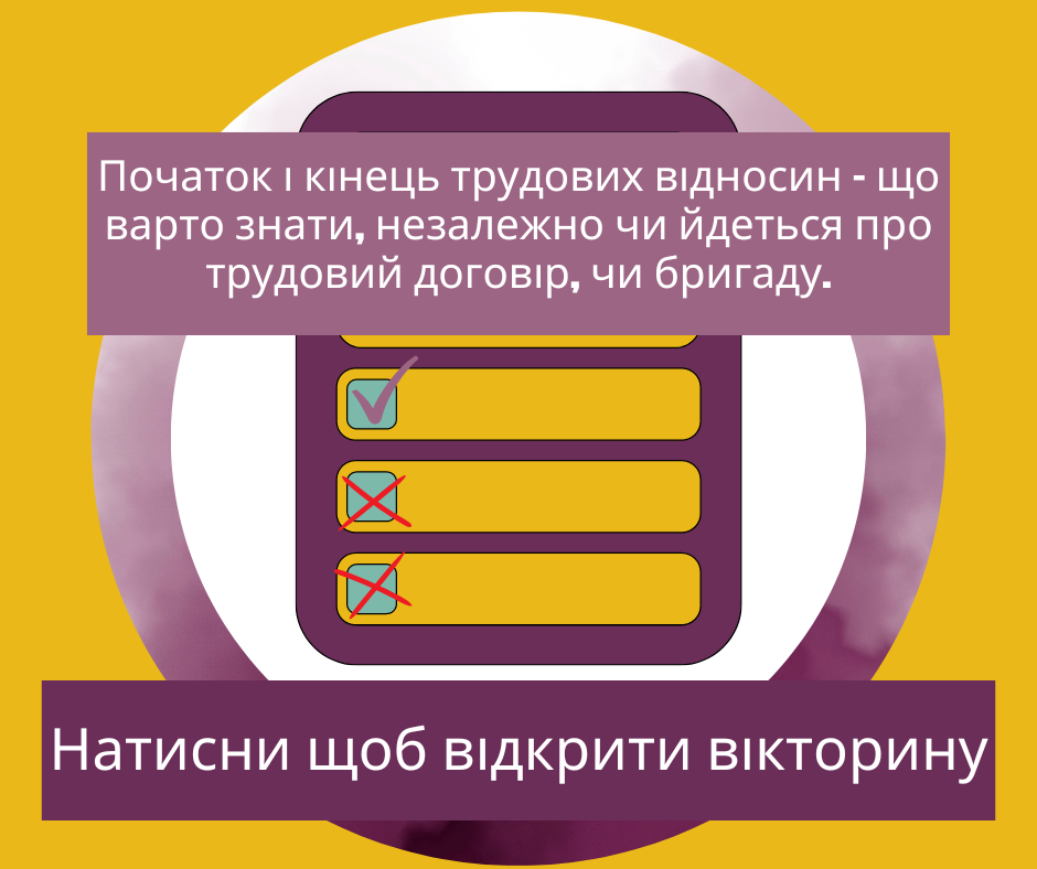 Договір, бригада, неповна зайнятість, працевлаштування, закінчення трудової діяльності, звільнення, огляд, рожевий листок, довідка про несудимість – що коли і як обрати, що проконтролювати і на що звертати увагу? Запрошуємо вас взяти участь у цій вікторині. Ми проведемо вас через підводні камені початку та кінця трудових відносин, і ви більше не будете задаватися питанням, чому не існує звільнення під час випробувального терміну, коли принести яке підтвердження, та про що потрібно пам’ятати в процесі відбору.